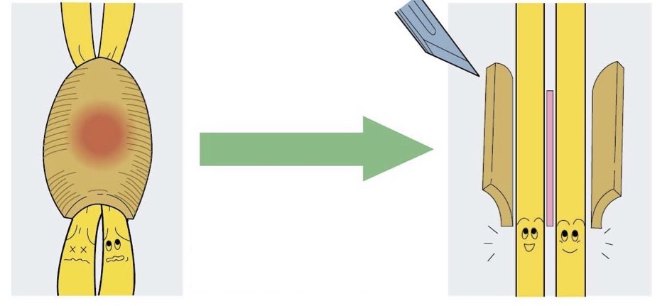 腱鞘をzig-zagに切離し、隔壁を切除したうえで、腱鞘を拡大形成