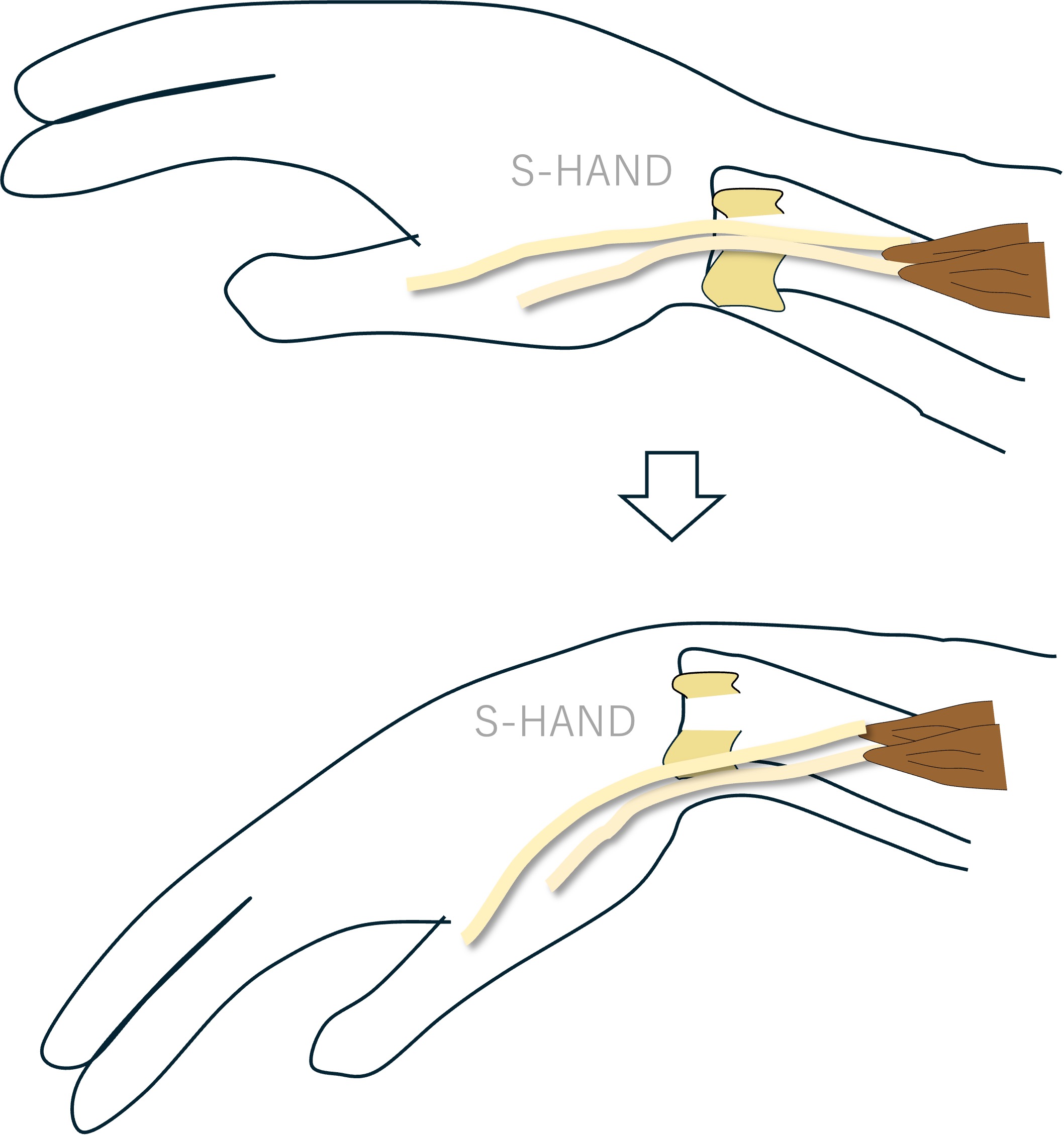 通常の腱鞘切開手術では、合併症として、腱の脱臼が生じることがあります。